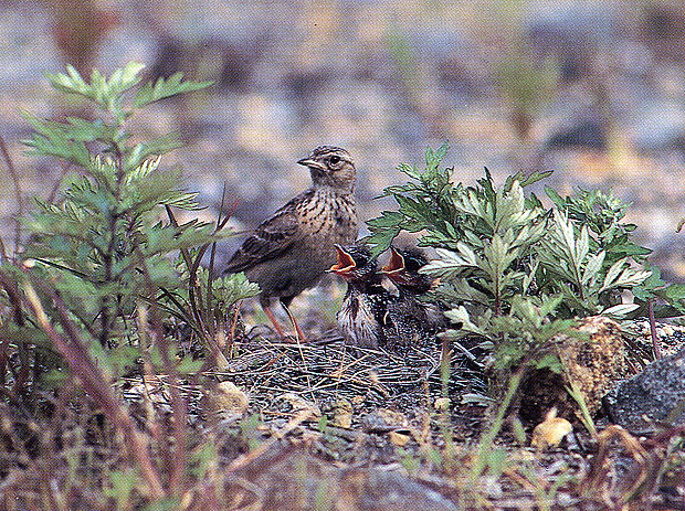 ヒバリの巣は地面の上に、枯れ草などをしいて作られます。卵の色があたりの色と似ているとはいえ、木の上や穴に作られる巣と比べると無防備です。そのため親が巣に帰るとき直接に巣に向かわず、少し離れたところに降り敵の目をごまかして、巣にもどります。