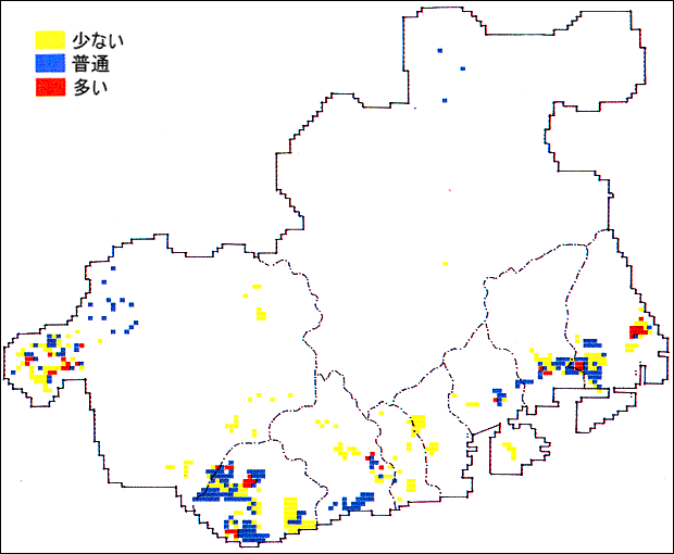 コウモリと言えば、何か不吉な印象を与えますが、このコウモリは、そんなことはありません。夕方暗くなりはじめると、どこからとなく飛んできます。川の上空、街路灯の周辺、夜間プールの上空など、昆虫が集まってくるところが多いようです。アブラコウモリは、人家の近くに生息するので、都市鳥よりも、もっと人間とかかわりのある生きものです。北区・西区では、未調査地が多かったものの、ほぼ全市域に分布しているのが分かりました。