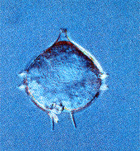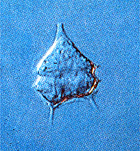 細胞の長さは70〜90ミクロンと大きい。体の上部はきれいな円錐形で、下部は円錐の山が2つ連なったような形をしている。細胞内はほとんど無色なので、大きな核と紅色の色素胞がよく見える。