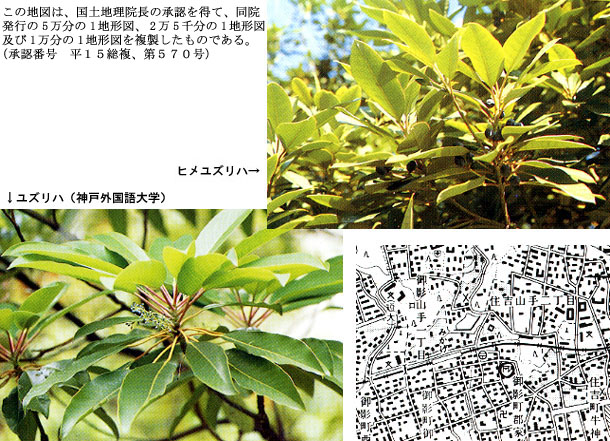 さて、この神社の名は、もと、譲る葉(ユズリハ)が多かったからではないかと書いた本があったので、ユズリハを探しましたが、見つかったのは本物のユズリハよりひと回り小さい葉をしたヒメユズリハでした。宮司さんにたずねますと、昔は一本あったがいつのまにか無くなったということです。どちらも暖地性ですが、ユズリハは山地に、ヒメユズリハは沿岸に生えています。神戸の海岸部の森にもヒメユズリハが点々と残っています。また、葉はともによく似ていてまちがえやすいのですが、葉の形はヒメユズリハの方が鋭く、葉脈がち密です。それに、樹の勢いは名に反し、ヒメユズリハの方が雄大で、大きくなります。どうやら社名は、文字どおり、弓と弦(つる)にまつわる史話から呼ばれるようになったと考える方がよいようです。