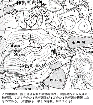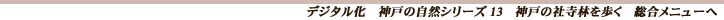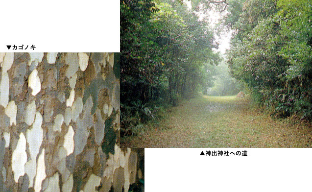 神出神社の南東部一帯はアラカシ・カゴノキの群落で、自然のよく残った林です。その他高木では、クロガネモチ・アラカシ・ヤブツバキ・アカシデが目につきます。なかでもクロガネモチは、胸高直径が52センチ、高さは18メートルもありました。高さ3〜8メートルくらいの亜高木、低木には、カゴノキ・ヤブニッケイ・ネズミモチ・アラカシ・ヤブツバキ・イヌビワなどがありました。林床にはカクレミノ・アラカシ・カゴノキ・ヤブツバキ・モチノキの幼樹やネザサ・テイカカズラ・マンリョウ・ヤブコウジ・ムベ・キヅタ・ナガバジャノヒゲ・ベニシダなどが見られました。