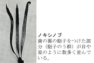 クスノキにつくノキシノブは、幹の分かれているところに着くことが多い。長さ10−20cm、幅5−8mmの葉で、葉の裏には胞子をつけた部分が星や目(八つ目)のように、たがいちがいに数多く並んでいる。このシダの属するウラボシ科という名はこの特徴に由来する。このシダは、しばしば屋根の軒端に生えることからノキシノブという名がついた。古くから歌に詠まれたシノブグサというのは、このノキシノブをさすのである。