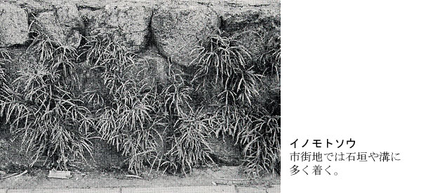 社寺・公園には、クスノキの大木がある。根もとに立って木を見上げてみると、たいていノキシノブというシダが着いている。石垣には細い葉を風になびかせているイノモトソウ、葉の表面につやがあって、乾燥する石の間によく生えているオニヤブソテツなどがすぐに目につく。