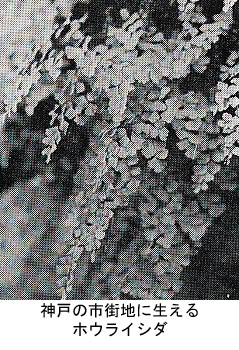 異人館付近にほ、ホウライシダが多い。ホウライシダは、神戸の市街地に新しく侵入したシダである。新しくといっても、20−30年も前からのようだが、異人館の多い生田区北野町付近、須磨区一の谷付近に多いのは不思議で、港町神戸の特徴を示すものとしておもしろい。湿りのある溝や石垣・土塀に着生し、場所によっては、四国・九州でさえ見られない大群落を作っているところがある。市街地の裏山が寒い冬の北風を防ぐこと、南の日光を受けて暖かいことがホウライシダの生育を助けているのであろう。
