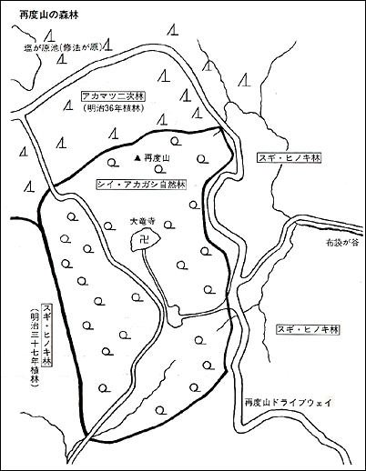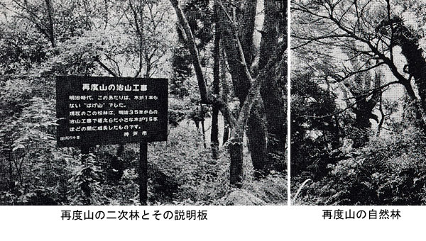 以上のように、再度山一帯の森林は、その構成からみて、大きく3つに分けられる。一つは大竜寺を中心に広がる自然林であり、一つは、再度山の北面や西側の植林後約70年を経過しているアカマツ・クロマツ・アイグロマツを中心とする人工林であり、他の一つは、自然林に続く南西や東側のスギ・ヒノキを中心とした人工林である。