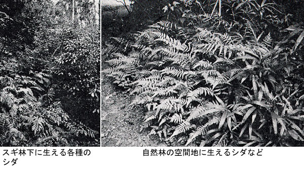 上の表から、常緑の照葉樹林下のシダとして十数種を数えたが、不思議なほどシダの種類が少ないことがわかる(シダ以外の下草も少ない)。林の下は夏も冬も、年間を通して日光を受けることが少ないからであろう。イノデ・ベニシダ・イタチシダ類が生えているだけである。しかし、林の中は年中、湿度が保たれることで、シイ・アカガシの樹幹には、マメヅタやノキシノブが着生している。特に、マメヅタがびっしりと樹皮を覆っているところさえある。湿度が保たれていることは、自然林の中で倒木ができ、ある一定の日光を受ける空間ができると、そこはすさまじいほどの生存競争の場になることでもわかる。そのような場所こそ、また、シダの絶好の自生地となるところであるが、そこに最初に進入してくるシダとしては、ヒメワラビ・ミゾシダ・イヌワラビ・イノデなどがあげられる。しかし、これらのシダは、やがて姿を消す運命にある。なぜなら、シイ・アカガシの次の世代が育ち、大きくなり、やがて、また、もとのような森林にもどつていくからである。