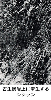 まえまえから、シシランなどの岩上着生シダは安定した古生層の岩上に多いのではないかと考えていたが、このシシランの着生している岩はやはり古生層の固いチャートの岩である。付近の地質は、花崗岩がなく、流紋岩や流紋岩質凝灰岩を含む有馬層群、それに砂岩・粘板岩・チャートを含む古生層である。シシランというシダは関東以西の本州・四国・九州に広く自生する常緑の暖地性要素のシダである。根茎は短くはい、単葉の葉を密生している。胞子のう群は葉の縁にそって長く縦に連なってつく。暗く、湿った岩上や樹幹に生育するシダである。