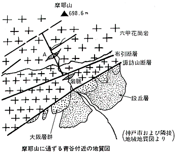 摩耶山に通ずる西の青谷を歩いてみる。南の市街地から東西に、諏訪山・布引断層が走り、谷筋も南北に小さな断層が走っている。図中のAはひん岩、閃緑ひん岩などの岩脈が入り、土地の様子は一層複雑になっている。このようなところにはたいてい崩壊地があり、その付近の樹木はよく茂っている。草本層も多く、崩壊した斜面にほシダやコケが生えている。シダでは、イノデ・ヒロハイヌワラビ・ゼンマイ・ミゾシダ・ヒメワラビ。シダ以外では、シロバナウソゼンツツジ・ヤブウツギ・コアジサイ・クサアジサイ・ショウジョウバカマ、その他鮮苔類などが多い。