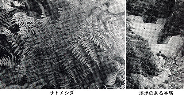 風化・崩壊の進む六甲山の各地には堰堤が多く造られている。この堰堤が造られるところは岩盤が露出しているところであるので、そのようなところは、また、シダのよい自生地でもある。したがって、新しく堰堤が造られたことによって姿を消したシダも多い。最近、造られた紅葉谷堰堤工事で、ツルデンダは姿を消したし、数年前のツェンティクロスから森林植物園へ通ずる谷の堰堤造りでは、サトメシダや、サトメシダとヤマイヌワラビの雑種のオオサトメシダがなくなった。
