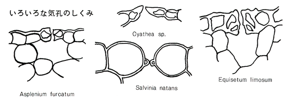 実際にシダの気孔をとりまく細胞を見ていくと種類によってさまざまである。気孔がほとんど1つの細胞に囲まれているもの、すっかり包まれているもの、ほぼ半々に2つの細胞に囲まれているものなど、気孔をとりまく表皮細胞はいろいろで、気孔の葉面への分布のしかた、気孔の形・大きさも各種さまざまである。