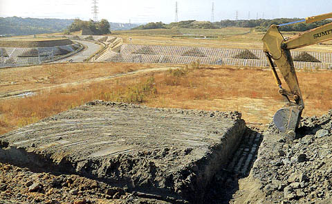 私達は、それまで地層を斜めに切りとった法面の中ほどにはりついて骨を掘り出していた。その日までに幅1m、奥へ40cmほど掘りこんだ。その結果30個ほどの骨を取り出したのだが、奥へ行くほど骨は多くなる。しかも奥へ行く程とりのぞくべき土砂の量は多くなってくる。もはや”たぬき掘り″とも言えるこの掘り方では不可能なところまできていた。