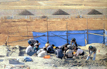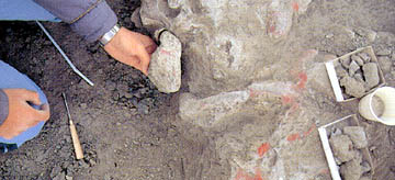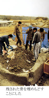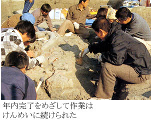骨の表面にやわらかい紙を何重にもかけ、その上に新聞紙をのせる。次に、あまり荷重がかからない程度に土をかける。オーバーハングしている部分は発泡ウレタンで保護をする。ダンボール紙で更に保護をして土をかけシートでおおう。四重にもかけたシートは周囲を鍵ホックをしっかりと打ちこむ。周辺に大きな材を配置して近よれないようにする。正月といえども4日間の空白ができる。発掘の再開は1月4日と打ち合わせ、それまでの無事をいのって1987年の発掘は一応終了とする。