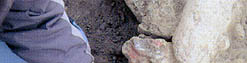 私達の心配は二つあった。その一つは盗掘である。骨は表面がかなり出ており、その気になって周りを破壊すれば容易に持つていくことができる。もう一つの心配は凍結である。幸いにも今年の冬は暖冬で今までは凍結しなかったが、表面が露出した骨が水を含み凍結すれば骨は壊れてしまう可能性がある。どうしても年内に作業を完了したい、そんな思いは強いのだが作業は遅々として進まない。乾さんは象牙の根元にへばりついた下がく骨の分離に挑戦、松尾さんも反対側の密集部の取りはずしを試みるがうまくいかない。みんな必死で年内完了をめざしてがんばるのだが見通しが立たない。