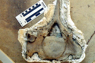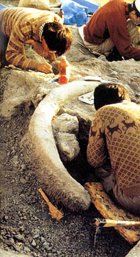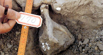 2本目の象牙の根元に近い付近からは下がく骨の一部が姿をあらわし、頭がい骨の部分も発見された。しかし、その産出状況は今までとは、かなり違っていた。一つの骨のまわりに別の骨が、おり重なるような状態で、しかも骨と骨とが結合して分離できないのである。象牙を取り上げるためには周りの骨を一つ一つ取りはずして象牙だけを浮き上がらせる必要がある。作業は終日まわりの骨を取りはずすことを目標に続けられた。骨の密集部にまわりから数人がへばりつき、すわりこんでの作業である。
