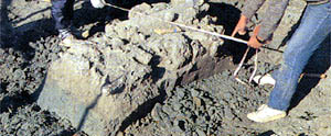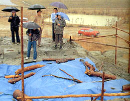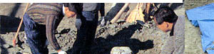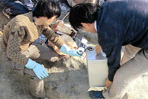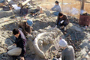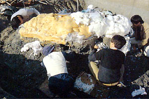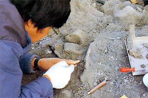 1月4日は朝から、あいにくの雨であった。発掘を始めてからはじめての雨である。残された骨全体をブロックとして取り上げるための段取りを打ち合わせた。