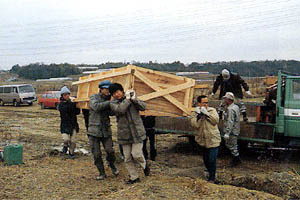 ショベルカーのショベルが、その梱包の下に入れられアームがゆっくりと上がる。メリメリ、バキバキ......周辺を保護したベニア板の割れる音であった。一方が少し持ち上がったところで止めて様子を見て木材を下にかます。やがて梱包は横だおしになり、ついでゆっくりとたおれるように下面を上に向けて横たわった。成功である。梱包にロープがかけられやがて宙に浮く。ショベルカーのオペレーターの緊張した表情。約20度の斜面をゆっくりとおろしていく。