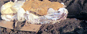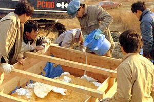 木わくが、かぶせられた上から大量の発泡ウレタンがそそぎこまれる。A液とB液を同量まぜあわせたドロドロの液体は1分もたたないうちに反応し、発泡をはじめる。やがて40倍にも膨張して固まったウレタンで木わくは、うずめられていく。約80lもの原液をほとんど使いはたした時、巨大な象化石の梱包ができあがった。