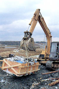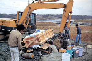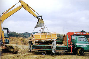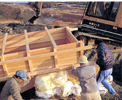 まず木わくはすでに用意してあるものでは間にあわない。長さ2.3m、幅1.2m、深さ70cmは最低必要である。この木わくを作ってもらうことになったのは森林植物園である。ブロックを浮き上がらせるためには周辺を1mは掘り下げる必要があるし、取り上げた木わくを道路まで、おろすために法面(のりめん)を削って道をつけなければならない。そのためのショベルカーの手配を開発局に依頼することになった。発泡ウレタンも相当量必要である。