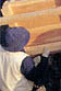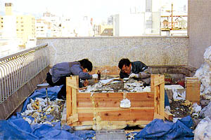 1月8日にはブロックを箱づめにしてショベルカーでつるして道路までおろす。トラックに、つみこんで教育研究所まで運ぶ。木わくの大きさは、研究所のエレベーターよりはるかに大きいし、その重さは1〜2トンと想定されるので人力では、とてもかつげない。クレーン事で6階の屋上まで持ち上げる。そんな段取りをしたのが1月4日から6日にかけてである。