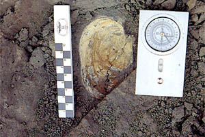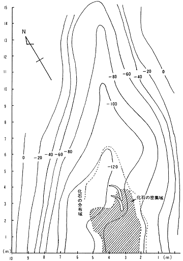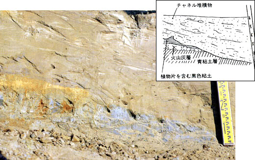 まず地層の情報から考えてみることにしよう。すでに書いたように化石のうずもれていた地層は細粒の砂とシルトが交互にたまってきれいなラミナ(葉理)を示す地層である。一番厚いところで3.2m。その下面は舟底のような形をしており、北東方面に十数m伸びる。このシルト層の上位と下位は青緑色の粘土層であり、下位の粘土層には厚さ5cmの火山灰層がはさまれている。下の粘土層と火山灰層はシルト層によって削り取られている。