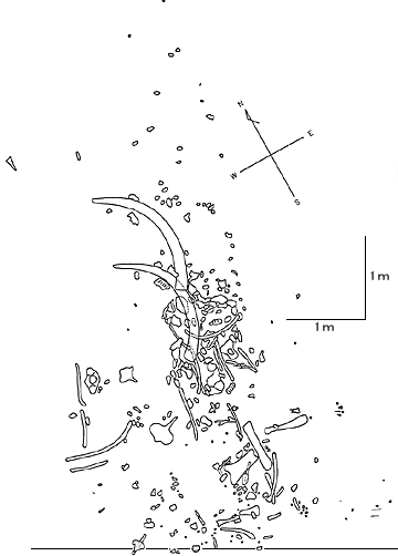 さて、アカシ象の骨はどのような状態でこの場に運ばれてきたのだろう。一つの考えは、この地点からかなり離れた所でバラバラになった骨が水流によって流され集められたという考えである。二つ目の考えは、象は、この場で死んでそのまま埋もれたというものである。三つ目は、他の場所で死んだ象は形を保ったままここに到達し、ここでバラバラになったというものである。