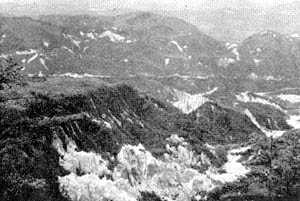 眼を東にやると、扇をひろげた形に畑が並ぶ船坂の村が美しい。船坂のすぐ東に、白水峡そっくりの崩壊地形がある。これは蓬莱(ほうらい)峡で、裏六甲随一の奇勝の地としてハイカー達に親しまれているところである。断層破砕帯特有の地形、一見ゴツゴツした岩場に見えるが、その実はざっくりした脆い地質の模様が機上からも、はっきり識別できる。