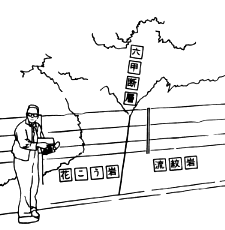 撮影地を記入した地図を狭い境内にひろげ、太陽光線とカメラの角度、撮影高度などを打ち合す。白水峡の上空では、琵琶湖は見えなくてもよいから、京都盆地の東山達蜂が遠望できる高度までのぼって欲しいと頼む。テキパキと要領よく、無駄のない機長の質問にくらべ、やや興奮気味で不得要領な説明をくり返すのが淋しい。