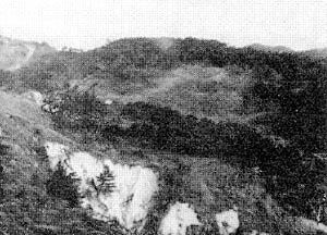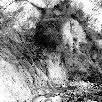 断層が通るところは崖崩れを起し やすく,遠くからでもその位置が わかる.撮影したのは昭和43年であり,現在はこの崖も草木が生えている(昭43撮). |