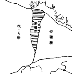 つまり、ここでは北から南へ花こう岩、断層粘土、砂礫層の順で重なっている。