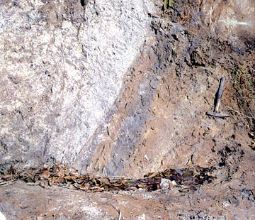 花こう岩から断層粘土へは急に変わり、両者は、一見、無関係のように見える。つまり、花こう岩が圧砕化されて、この場で粘土化したものが、この断層粘土ではない。両者の境が漸移的に変化しているのではなく、急変している。この断層粘土は、他の所から由来した可能性が大きい。