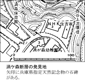 さらに、この渦ケ森断層ほ兵庫県天然記念物の指定をうけて、永久保存の措置が講じられているが、現在は、ヤシャブシがすっかり断層をおおうほどに生長、その断層面ほ観察できない。発見のとき、断層面は北から60度東へのび、北へ40度の傾斜を示していた。