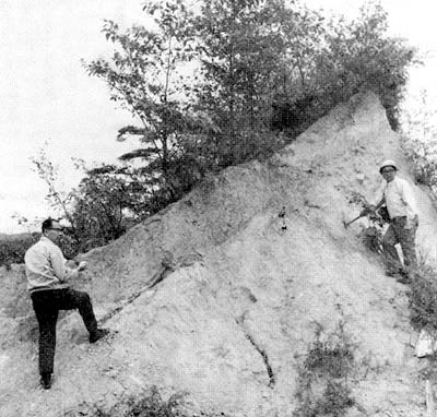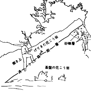 この断層破砕帯は造成地を北東−南西方向に横切るかたちでのびていたが、その東に、図に示したょうに基盤の花こう岩をおおう厚さ1メートルほどの礫層を押しきるように花こう岩がのりあげていた。この古い岩石が新しい地層の上に衝きあげた関係は、五助谷や東お多福山南麓でみた五助橋断層の断層面と同じ関係である。ただ、ここの礫層ほそれができた地質時代を示す化石を含んでいないが、どうみても、地層のかたさや風化の程度からみてさきの東お多福山南麓の大阪層群よりも格段に新しい。おそらく、数万年ないし十数万年前にできた地層としか思えない。