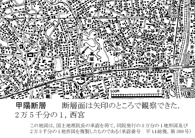 ここには高さ10メートルあまりの崖が南北に、西宮市と芦屋市との境界にそって、100メートルほどつづいている。この崖の南はし近くに、写真のように、ひとすじの地層の乱れた個所を境として両側の地層がはっきり食いちがっている。これが甲陽断層の断面である。