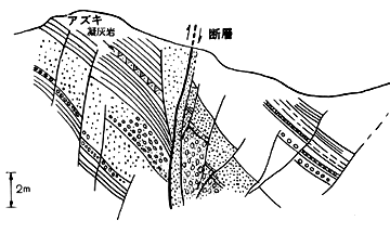 ここの断層面は地層が食いちがっていて,初心者の学習には絶好の場所であったが,最近はコンクリートでうすくおおわれてしまった.