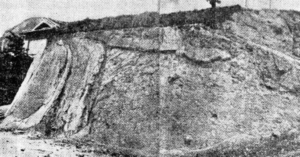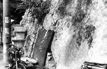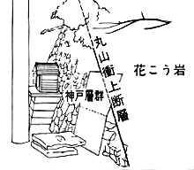 この六甲山成因の謎をとくきっかけになった貴重な断層面の現場は、残念であるが、かんじんのところが石垣でおおわれてよく見えない。たぶん雨水などで深くけずられて崖くずれをおこす危険度がたかまったので、天然記念物と知りながら石垣の補強工事をしたにちがいない。