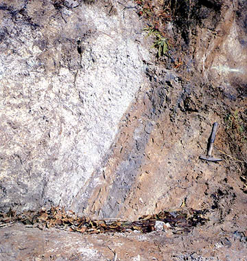 あの堅い花こう岩が断層によって圧砕され、水の加水分解作用をうけ、縞状の粘土に変化してしまったもの