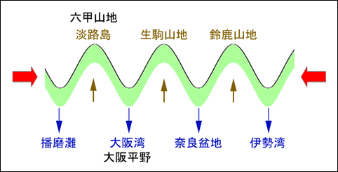 マグニチュード7程度の地震では、断層の動きは1〜2m程度というのが経験的にわかっています。1mは1mmの1,000倍ですから、六甲山地は兵庫県南部地震ほどの地震を1,000年に1回(つまり1,000年で1m)、100万年間に1,000回繰り返しながら現在の姿になってきたといえます。