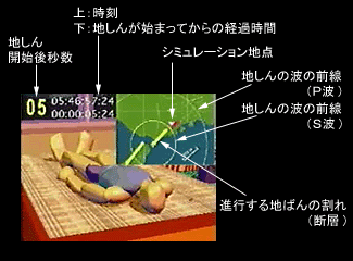 同時に、割れはじめたところから、黄色の線で示された地震の波(地震波:じしんは)が、円状に広がっていきます。最初に広がるのがP波(ピーは)、少し遅れて広がっていくのがS波(エスは)です。S波が大きなゆれをもたらします。ですから、S波がシミュレーション地点に到着したときから、大きくゆれはじめることが分かります。
