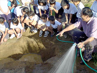 - 神戸市内の校庭は、小さなレキ、砂、泥の混じったマサ土(花こう岩の風化物)でできているので、これで高さ1m程度の山(2m×2m)をつくる。三方はベニヤ板などで土留めをする。