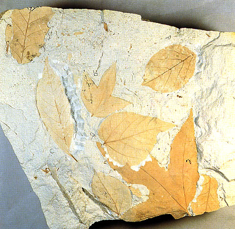 さまざまな葉の化石が、1つのブロックから出ました。卵形の円いもの、大きく切れ込んでいるもの、丸みのある三角形の葉などいろいろです。この本では葉の形をもとに化石の名前が調べられるように工夫してみました。