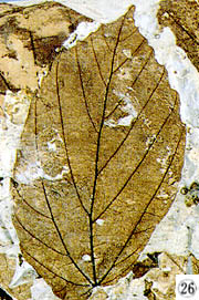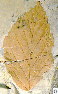 葉は細長い楕円形で先端は鋭く尖り基部はくさび形である。葉の上部の縁にはのこぎり葉があり、2次脈は葉の縁り近くで上方に曲がり、上の2次脈につながり、ループをつくる。
