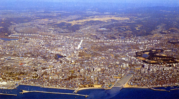 明石海峡上空より見た明石市および神戸市西部(昭和53年3月) 約7千年前の縄文の海(破線)は明石川に沿って深く入りこんでいた。↓は神戸市玉津環境センター。