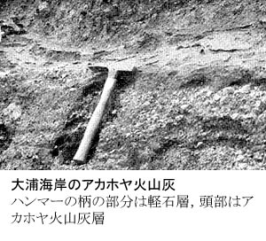 島の人口、200人というのは、ここも本土の農漁村と同じく高齢者の多い人口構成で、ひっそりとした島である。この島の唯一の避難港が大浦海岸にあり、小型の爆裂火口を想像させる直径100メートルに満たない湾入部がそれである。そこへおりる崖の途中にアカホヤ火山灰が、軽石層とともに残っていた。この島は全島が火山噴出物でできているから、かえって特定の火山灰層を探すとなると、私たちのような火山調査の経験のない者には難しいものである。なお、この薩摩硫黄島と隣りの竹島とが鬼界カルデラの外輪山の一部であり、カルデラの本体ともいうべき凹部は海底にある。
