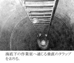 3.3気圧、マンロックと函内作業室との気圧差が全くなくなったとき、シリンダへのハッチを開き、身をすぼめて直径1.3メートルのシリンダ(鉄製円筒)に入り、垂直降下の態勢をとる。シリンダの長さは30メートル。地上ならば7〜8階建のビルの高さに相当する。もし、この高さをビルの外壁に一直線にとりつけたタラップを伝って地上に降りるとすれば、周りが明るく、下界が見えすぎるため、高所恐怖症になり、足がすくんでしまうにちがいない。しかし、ここは高度30メートルとはいえ、適当な暗さであり、そして数メートルおきに転落防止の金網が踊り場式にはられている。足許を確かめつつも、あまり足下をみないで、一気に刃口のある海底下に降りる。