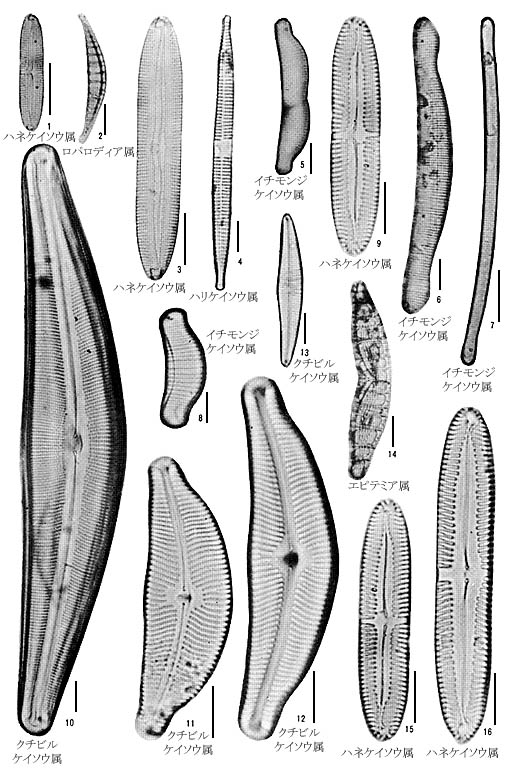 ここは、神戸港の海底下であるのに、目の前にあるのは淡水のところに堆積した地層である。このピートが淡水のところにできたものであるという証拠は何かあるか。ケイ藻の化石はどうだろうか。ケイ藻はケイ酸の成分の殻をもつ藻類であるが、非常に小さく肉眼では見えない。川でアユが水あかを食っているが、その水あかはケイ藻である。ケイ酸でできているケイ藻の殻は頑丈で、死後も殻は堆積物の中に化石として残っている。しかもケイ藻の殻は、種ごとにその形態がちがっている。そして、好都合なことに、淡水と海水とでは、生息している種がちがい、それが、地層ができたときの環境を知る大きな手がかりになる。ふつう、湖、沼、川などの淡水にすむケイ藻の形は棒状や羽根板状をしているのに対し、海にすむケイ藻は円板状をなしているものが多い。