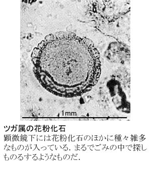 それでは、その湿原の周辺にはどんな木や草が生えていたのだろうか。ピート中に含まれている花粉や胞子の化石をとりだしてみよう。このピートから約30種の花粉化石が見出されたが、どれも現在の六甲山頂よりも高い、つまりもっと寒冷な土地に生えている植物が多い。その主なものをあげると針葉樹では、トウヒ、コメツガ、ウラジロモミ、アカマツ、ヒメコマツ等であり、広葉樹ではヤチヤナギ、ヤナギ、ハシバミ、シデ、カバノキ、コナラ、シナノキなどである。たとえば、トウヒは今の六甲山には自生していない。近畿地方では紀伊山地の大台ケ原の1,400メートル以上の高さに生えている。その他の樹木も現在は1,000メートル級の山地に生えているものが多い。
