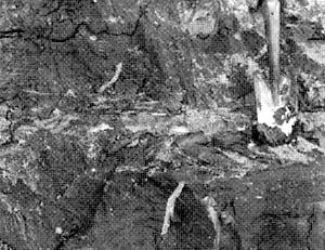 写真のミミズがはいまわったような穴に砂がつまっているのは、かつて、ここに海が入ってきたとき、波うちぎわの潮の満ち干するところに生息していたカニ類やゴカイ類、貝などのすんでいた巣穴である。そこを住居とした生物たちの死後、砂がその巣穴にたまって残ったものである。ここからニオガイの化石も採集された。ニオガイは岩や泥中に穴をうがって生活する二枚貝で、生活型から穿孔貝(せんこうがい)ともいわれる。関東地方南岸で、このニオガイの生息深度をくわしく調べた記録があり、それによれば、ニオガイは海面上30センチから海面下80センチの間に生息している頻度がもっとも高いという。ニオガイのみつかったところを当時の海面と判断してよいわけである。