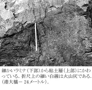私は港大橋での調査のとき気づいたのであるが、深度24メートルあたりでラミナをもつ層から、地層の特徴はがらりと一変して、非常に緻密な粘土層にかわる。これは、この時期に海面がぐっと上昇Lて、いままで水深数メートルの潮間帯であり、三角州でいえば、前置層に相当していた部分が、一気に水深十数メートルの底置層にかわったのではなかろうかと思った。その年代は港大橋では7,290年±235年前であった。港大橋のつぎに調べた神崎川口の中島大橋でも深度21メートルで、やはり層相は粘土層に急変する。ここでの14C年代は8,190年±130年前であった。