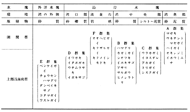 内湾における生息環境と貝類遺骸群集区分 (松島・大嶋、1974)