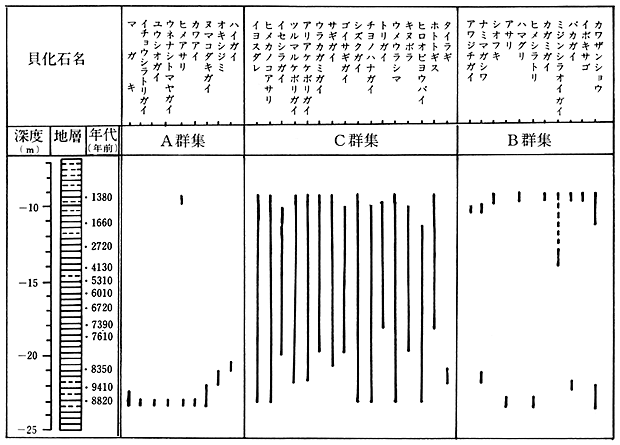 このように整理してみると、A群集の潮間帯から、B群集の時期へ移ったあとの期間が非常に短く、C群集の時期に移っている。このことは、海面上昇の速度がはやく、比較的短期間のうちにここが汀線から湾央的な泥質域に変わったことをあらわしている。